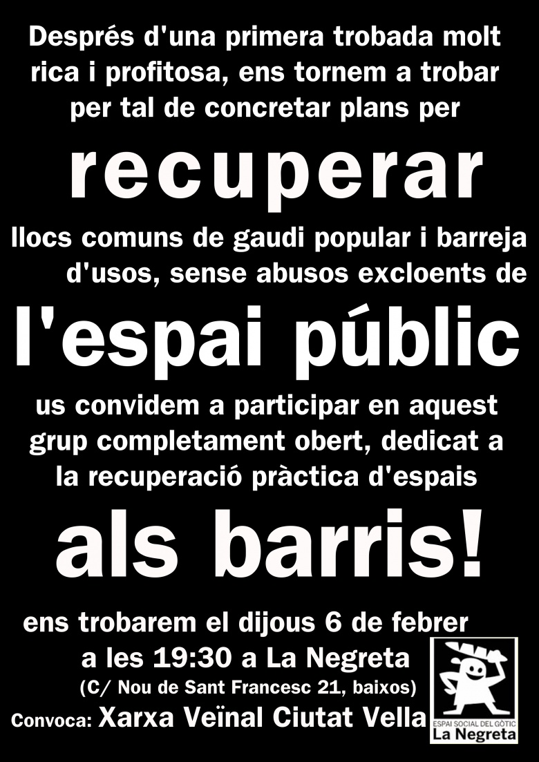 Próximo jueves 6 de febrero a las 19.30h reunión abierta del grupo sobre Espacio Público, en La Negreta, C/ Nou de Sant Frances 21, Barcelona.