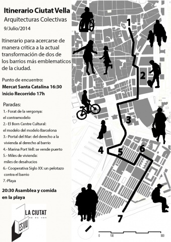 El miércoles 9, en el ecuador del encuentro, diferentes colectivos que conocen de primera mano la problemática de Ciutat Vella nos darán un paseo por algunos puntos críticos de la zona. Empezando en el Forat de la Vergonya, nos llevarán hasta la Barceloneta, donde acabaremos la ruta y debatiremos las cuestiones que vayan surgiendo.