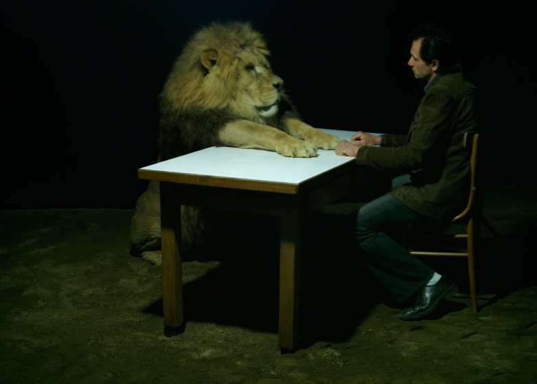 Il gesticolare tra le mani dell'uomo e le zampe del leone allude al concetto di noia profonda così come l’ha descritta Heidegger intuendo un’analogia tra lo stordimento dell’animale e lo stato d’animo della noia, ritenuto dal filosofo fondamentale per ogni filosofare. Heidegger parla di noia per capire cos’è mondo per l’essere umano e a tal fine distingue l’ambiente dell’animale dal mondo umano. L’animale vive in un ambiente nel senso che non ha una relazione con degli enti in quanto tali, ma solo in quanto suoi disinibitori ossia come attivatori di suoi istinti specifici; le cose dunque gli sfuggono nella loro essenza. L’animale è stordito dall’ambiente, è assorbito da esso e sospinto senza sosta da una molteplicità istintuale. L’essere umano vive in un mondo, o meglio è costruttore del mondo, proprio perché a differenza dell’animale non ha un ambiente che lo avvolge come una protesi, essendo carente di istinti specializzati. Nello stato d’animo della noia però, all’uomo si rivela un rapporto con il mondo che è vicino a quello dell’animale con l’ambiente: sostiene Heidegger che in questo stato d’animo vi è un venir meno dell’ente in quanto tale, ovvero nella noia profonda l’ente si ritrae, non ha più nulla da dirci e ci lascia vuoti. L’ente si ritrae lasciandoci vuoti, e siamo tenuti in sospeso dal tempo perché viene meno il suo naturale scorrere secondo l’articolazione di passato, presente e futuro che non sono altro che la modalità per scandire il ritmo del nostro agire. Il tempo ci incanta e incatena nella sua essenza disarticolata e proprio in questa condizione di inattività il tempo ci rinfaccia tutte le possibilità che giacciono inutilizzate. Per questo si può ritenere che lo stato d’animo della noia esprima al massimo il concetto di potenza tanto che Heidegger parla addirittura di ultrapotenza.