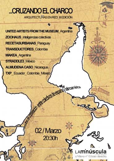 Arquitecturas en red IIIª edición_2 de MARZO_ 20h30_LAminúscula asociación_c/Villena 13_Valencia "Exposición y ciclo de presentaciones sobre proyectos de cooperación llevados a cabo por colectivos nacionales en Latinoamérica. Se expondrán y presentarán trabajos realizados al respecto. En una situación de precariedad local cada vez más acuciante, resulta paradójico el cruzar el charco para ayudar a gente históricamente más necesitada que nosotros. La precariedad de determinadas comunidades latinoamericanas es a su vez alarmante y fuente de inspiración. La creatividad de equipos nacionales se mezcla con la imaginación basada en la necesidad, para proponer soluciones pragmáticas, imaginativas y directas a cuestiones cotidianas". ZOOHAUS - RECETAS URBANAS - MAKEA - TODOPORLAPRAXIS - UNITED ARTIST FROM THE MUSEUM - TRANSDUCTORES - STRADDLE3 - ALMUDENA CASO