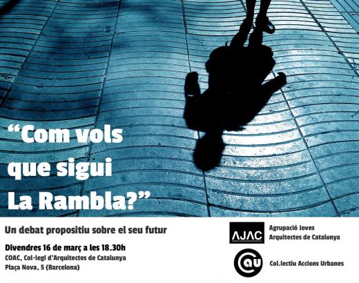 “Como quieres que sea la Rambla?" Un debate propositivo sobre su futuro Viernes 16 de marzo a las 18.30h COAC, Col·legi d'Arquitectes de Catalunya Plaça Nova, 5 (Barcelona) La Rambla ha sido durante mucho tiempo el espacio publico privilegiado de la ciudad de Barcelona. En los últimos años parece haberse convertidos en el catalizador de todos los problemas de la ciudad: exceso de turismo, abandono de parte de la ciudadanía, foco de atracción de la pequeña criminalidad. En los últimos meses una serie de iniciativas plantean su recuperación. El Col.lectiu Accions Urbanes y el Ajac invitan a todos los arquitectos a un debate propositivo sobre el futuro de este espacio público. En el curso del acto se presentará la consulta vecinal “Com vols que sigui la Rambla?" organizada por la Assemblea Veïnal per a una Rambla democràtica que se llevará a cabo los próximos 22 y 23 de abril.http://tornemalarambla.blogspot.com/“Com vols que sigui La Rambla?" Un debat propositiu sobre el seu futur Divendres 16 de març a les 18.30h COAC, Col·legi d'Arquitectes de Catalunya Plaça Nova, 5 (Barcelona) La Rambla ha sigut durant molt de temps l'espai públic privilegiat de la ciutat de Barcelona. En aquests últims anys sembla haver-se convertit en el catalitzador de tots els problemes de la ciutat: monocultiu turístic, abandonament de part de la ciutadania, font d'atracció de la petita criminalitat. En aquests últims mesos una serie d'iniciatives plantegen la seva recuperació. El Col·lectiu Accions Urbanes i el Ajac conviden a tots els arquitectes a un debat propositiu sobre el futur d'aquest espai públic. Comptarem amb una presentació de la consulta veïnal“Com vols que sigui la Rambla?" organitzada per l'Assemblea de Veïnal per a una Rambla democràtica que es portarà a terme els pròxims 22 y 23 de abril.